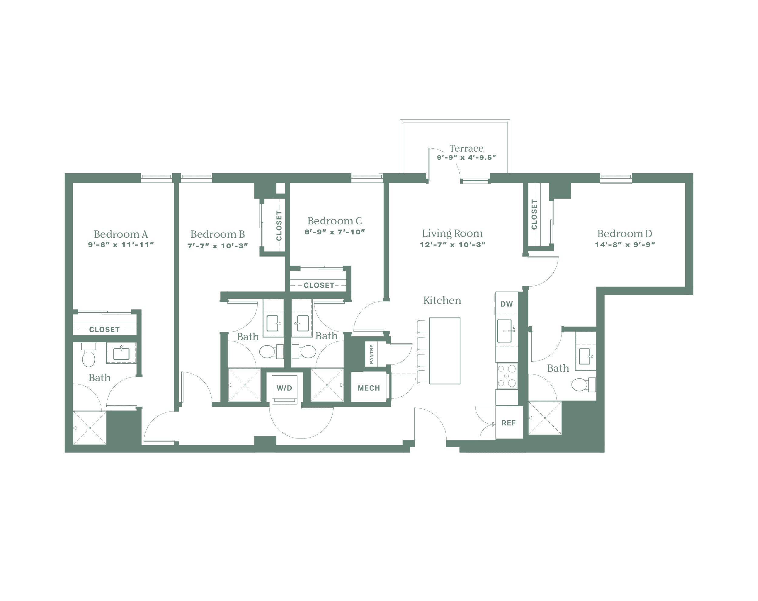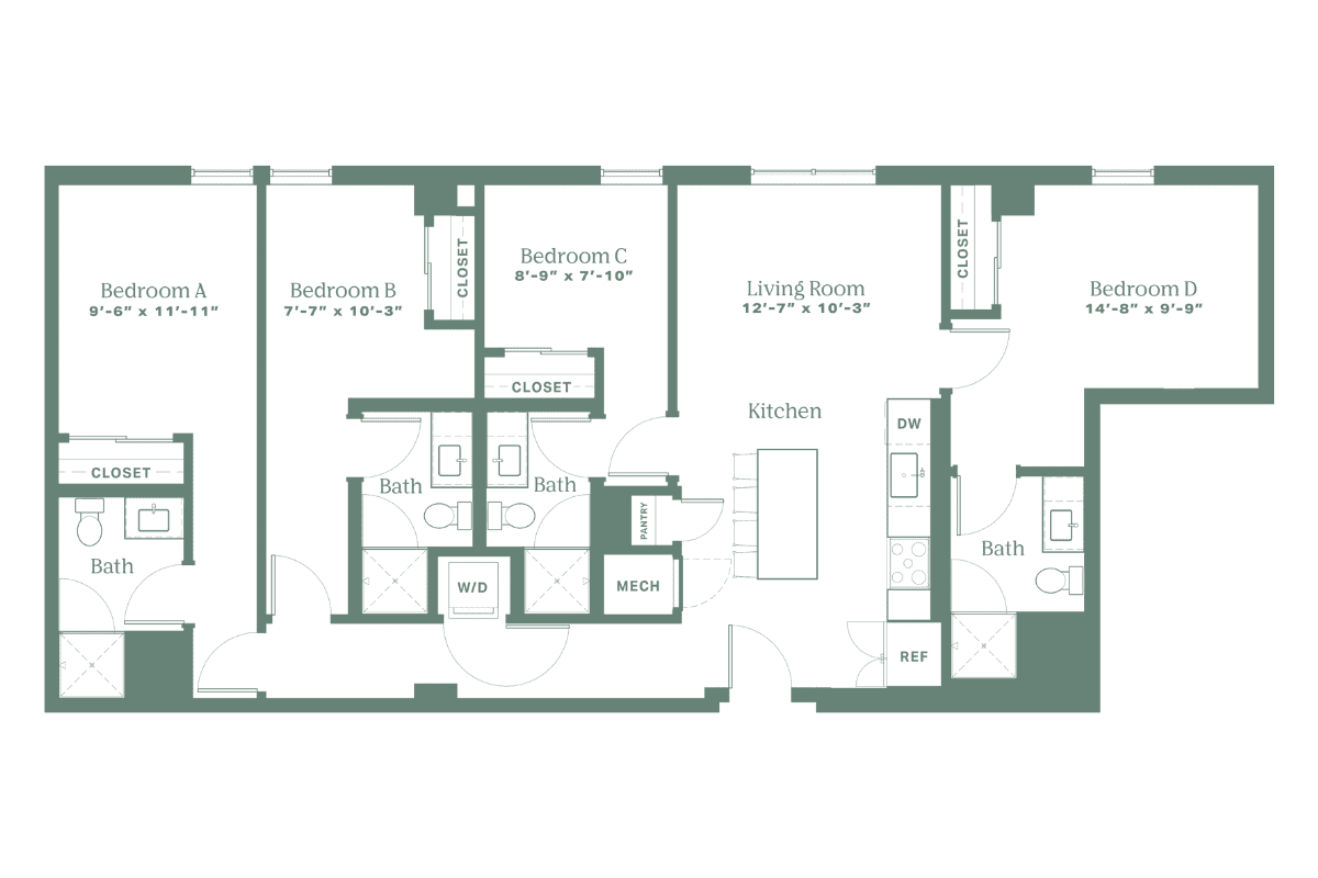 The Santa Fe brings thoughtful structure to student living. With an open kitchen and living space at its core, you can cook, gather, or enjoy quiet moments—all while maintaining your own space. Clean design and evenly spaced rooms make this layout an easy pick for balanced living.