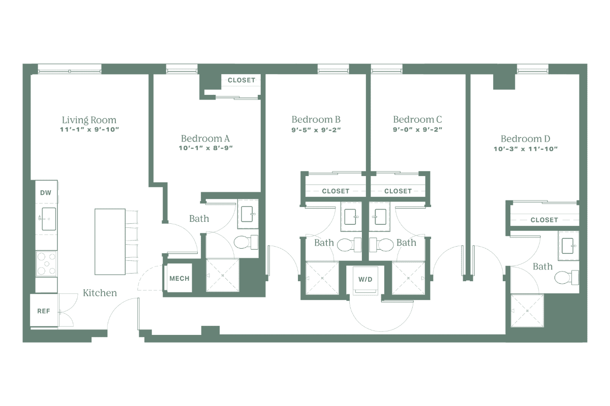 Welcome to the Skylark, a four-bedroom floor plan for you and your three best friends. It features a shared living area that’s equal parts casual and efficient. Plus, the large kitchen island offers the perfect spot for you and your roommates to gather and enjoy your days.