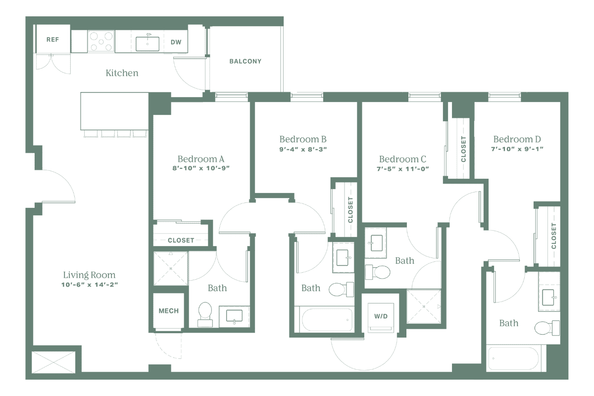 Bedroom D Dimensions: 7’-10” x 9’-1” Bathroom: Ensuite, Shower/Tub Combo Closet: Standard (Bypassing doors)