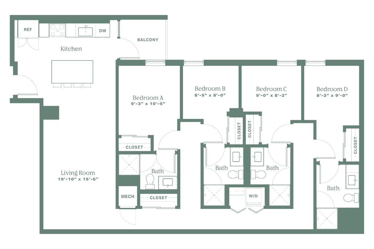 The Sterling is your go to four-bedroom when you want space that feels both social and personal. A spacious kitchen and living area set the scene for everything from roommate dinners to movie marathons, while a private balcony offers a breath of fresh air. With ensuite bathrooms in every room and clean modern finishes throughout, The Sterling gives you room to live and space to recharge.